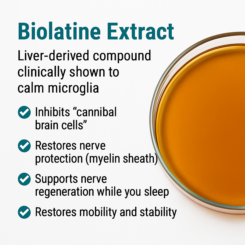 by calming overactive microglial cells and restoring nerve function from within.